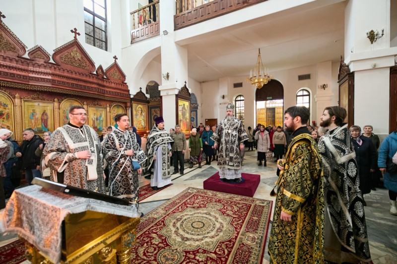 В пятницу первой седмицы Великого поста глава Чувашской митрополии, Высокопреосвященнейший Савватий, митрополит Чебоксарский и Чувашский совершил Литургию Преждеосвященных Даров в нашем храме. Его Высокопреосвященству сослужили настоятель храма иерей Александр Спиридонов и клирики храма протоиерей Евгений Давыдов, иерей Димитрий Головач и иерей Димитрий Петров. Богослужебные песнопения исполнили хор храма регент Марина Алексеевна Берман. По заамвонной молитве было совершено молебное пение с чтением канона святому великомученику Феодору Тирону и освящение колива. По окончании Литургии митрополит Савватий обратился к верующим с Архипастырским словом наставления и препреподал благословение на прохождения поприща Великого поста.